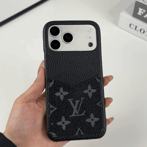 This leather monogram iPhone case features a card holder with classic black printing. Designed for the iPhone 17 Series, it offers secure card storage, reliable protection, and a timeless luxury style for everyday use.